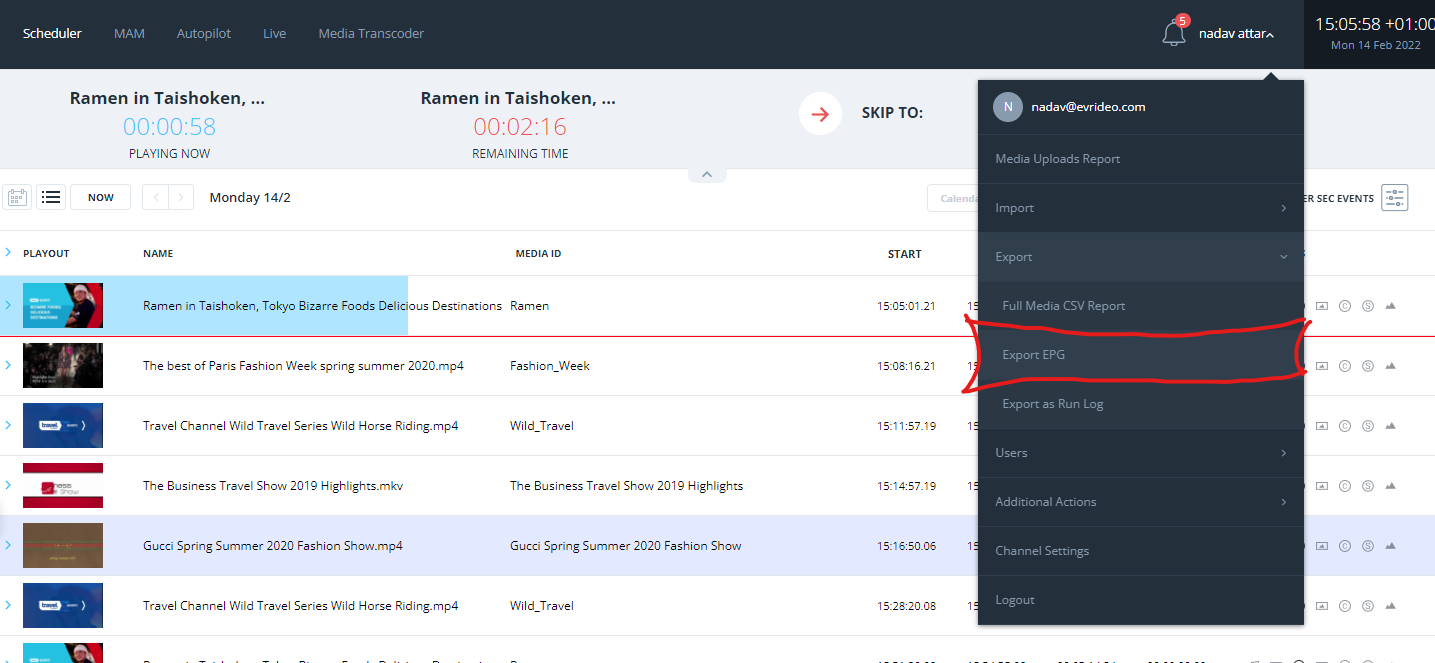 To export an EPG, go to the menu located on the top-left, select "Export," there, select "Export EPG."