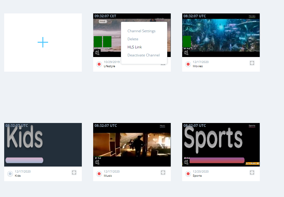 To generate an HLS preview of any of the existing channels, hover over any one, and select the 'HLS link' Option.