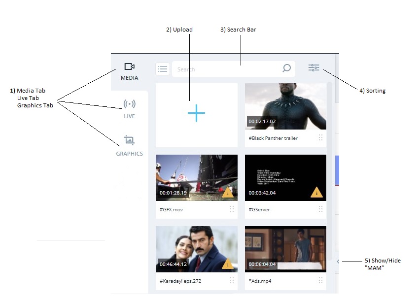 - Media / Graphics / Live Tabs - the MAM contains 4 vertical tabs for quick access between different sections.
